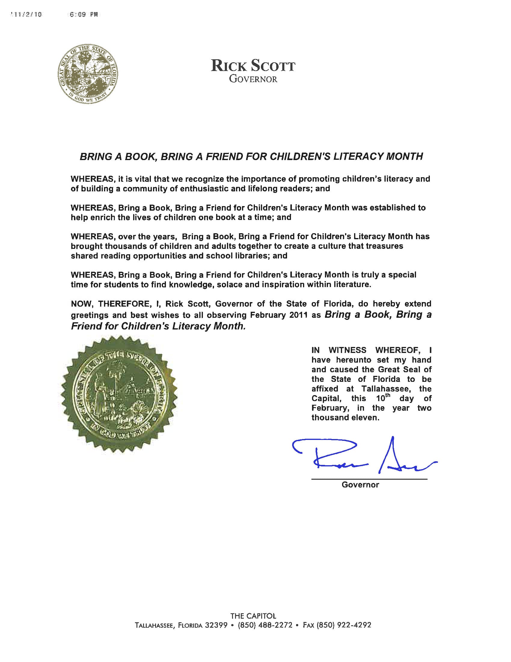 Florida Governor Rick Scott proclaimed February as “Bring a Book, Bring a Friend for Children’s Literacy Month in 2011 and continues to recognize the student-led organization’s efforts to promote literacy and leadership.