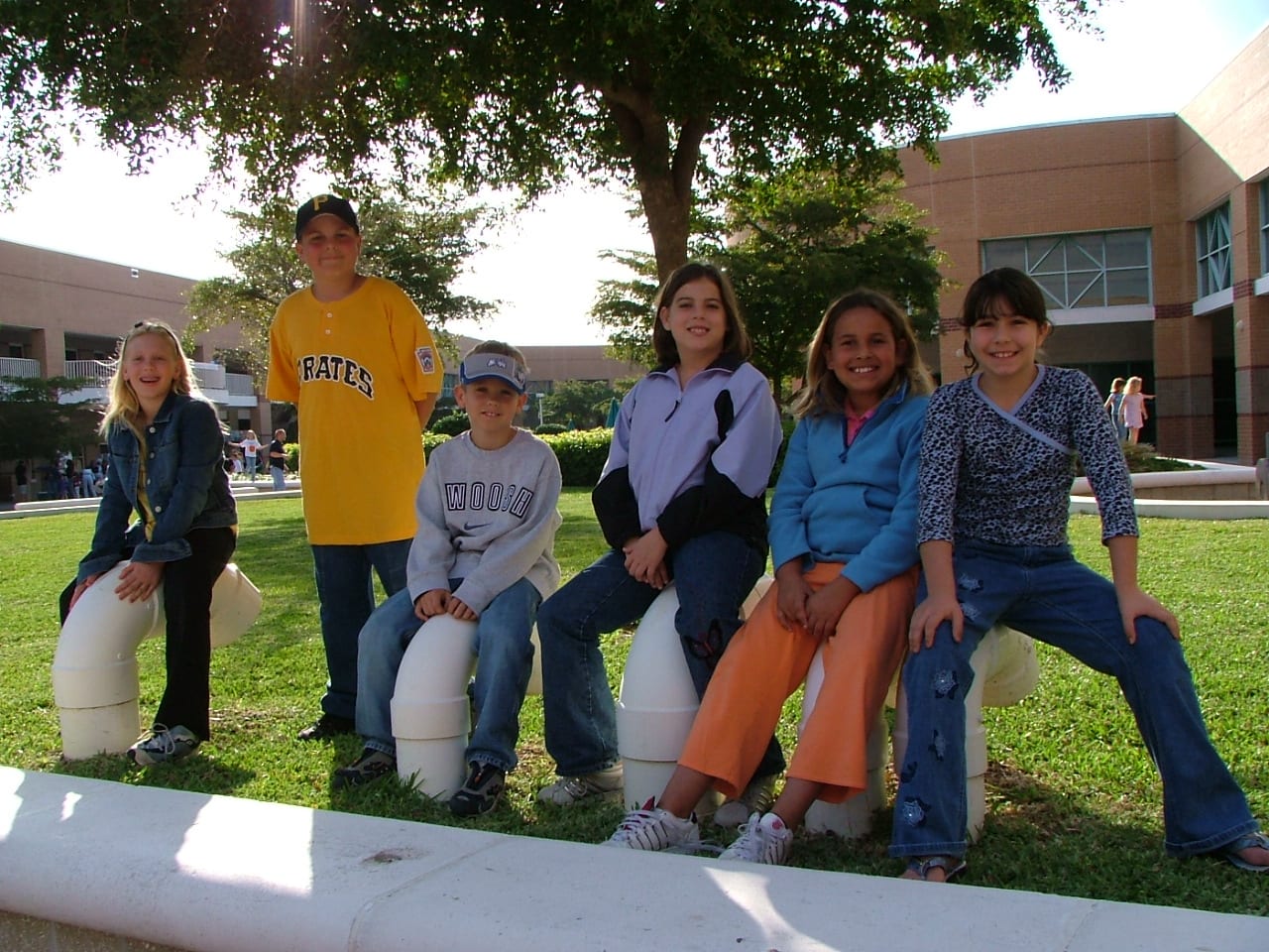 On location reporters for the Morning Show at Laurel Oak Elementary School: Erin wanted a fun activity for classmates, so her mom Karen videotaped teams of her fourth grade classmates as “on location” reporters for school events. (Erin’s younger brother Patrick, then a second grader, also got to participate.) L-R, Erin Clawson, Matthew, Patrick, Danielle, Shelby Mitchell – pose before videotaping their first on-location interviews of students and staff at Laurel Oak’s Family Fun Night (hosted by Gulf Coast High School). Photo by Karen Clawson