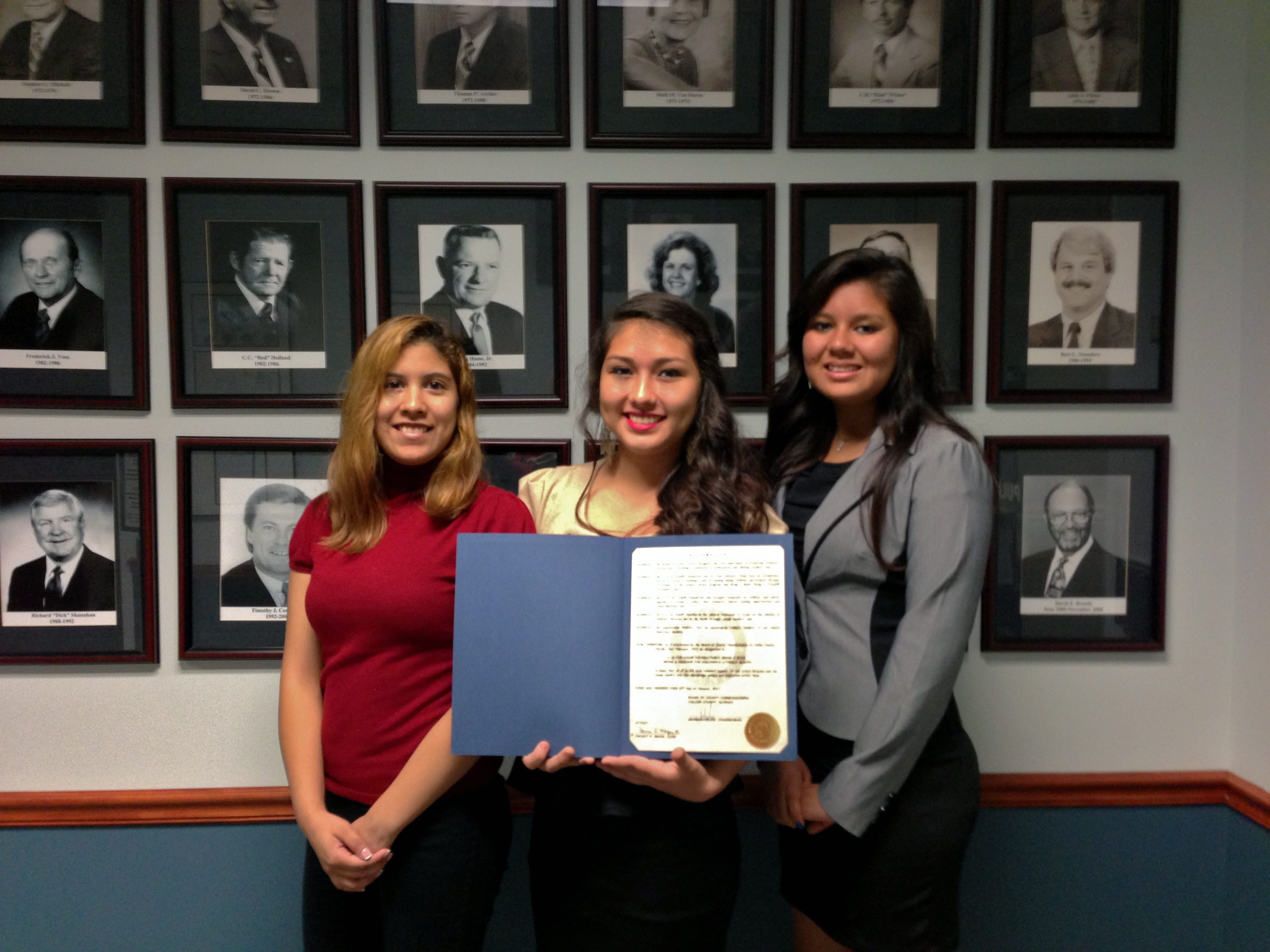 L-R: Alexandra Almora, Ninfa Antunez and Miriam Romero , Lorenzo Walker Institute of Technology and Lorenzo Walker High School show the proclamation presented by the Commissioners of Collier County 2013. The student leaders served as a PR team for K is for Kids and the From the Heart Teen Fashion Festival 2013.