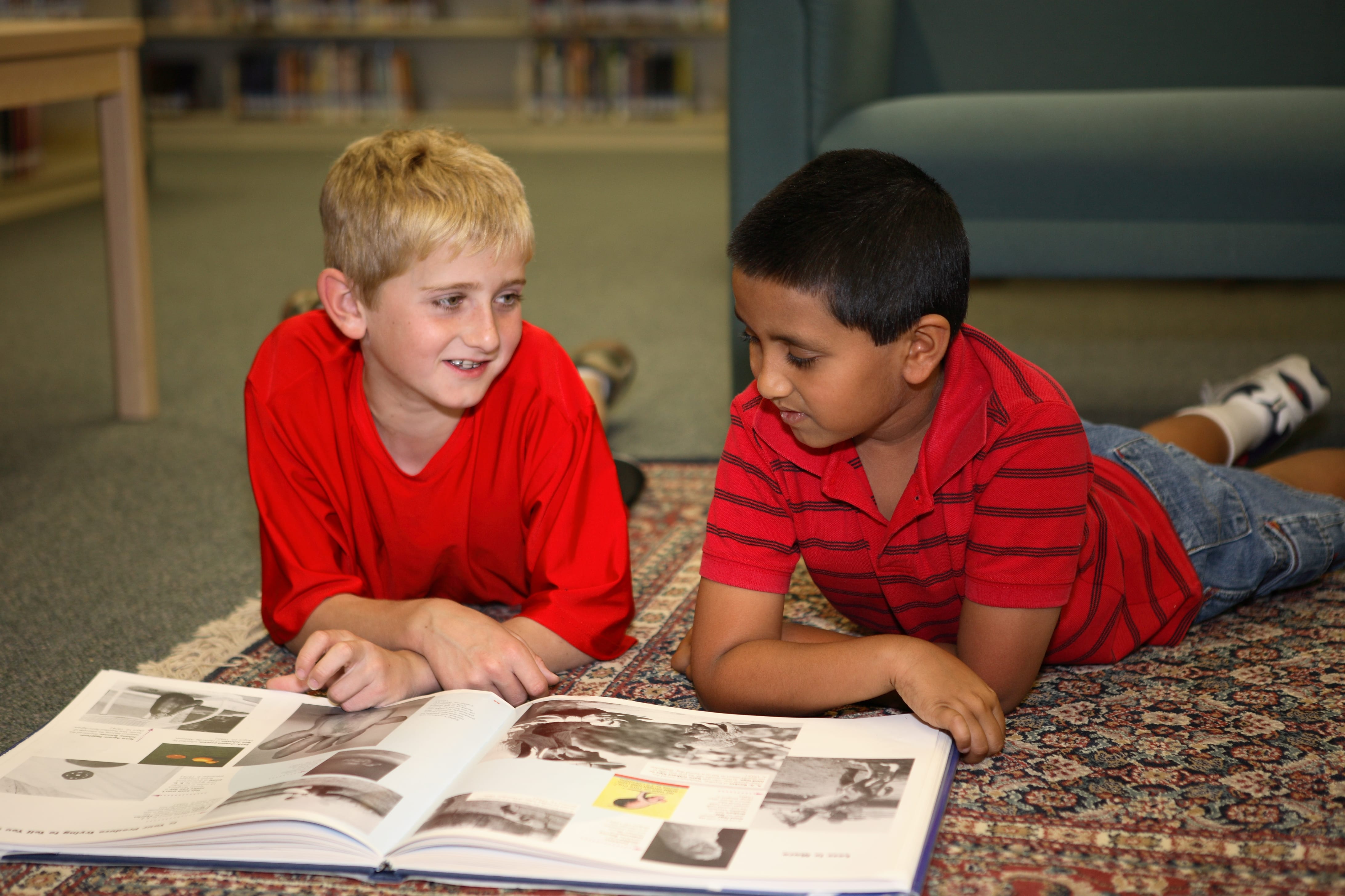 Photo by Karen Walsh Haupt. As K is for Kids launched with the help of a handful of children, two young boys enjoy sharing a book. February 2008, North Naples Middle School Library