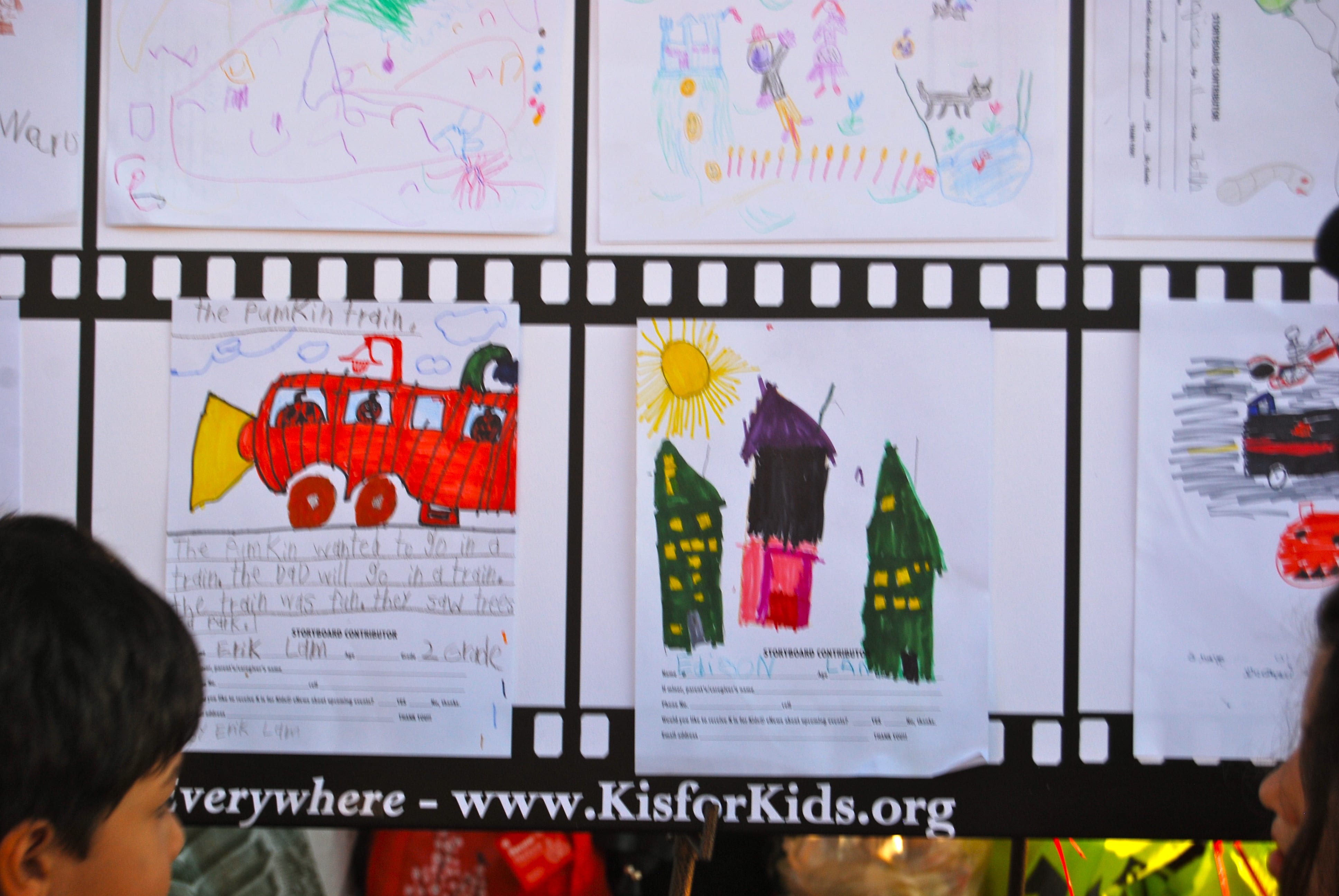 Children created storyboards on canvas that the older students later that the teens later put into short videos. The boy above illustrated the pumpkin train.