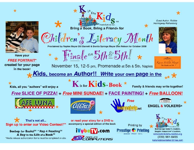 K is for Kids’ Bring a Book, Bring a Friend® for Children’s Literacy Month was proclaimed in 2008 by the Mayor of Naples, the Mayor of Bonita Springs, the Collier County Commissioners and the Governor of Florida. The proclamation recognized student leaders encouraging children to read more and fueling their passion for reading by giving them new books to read and keep.