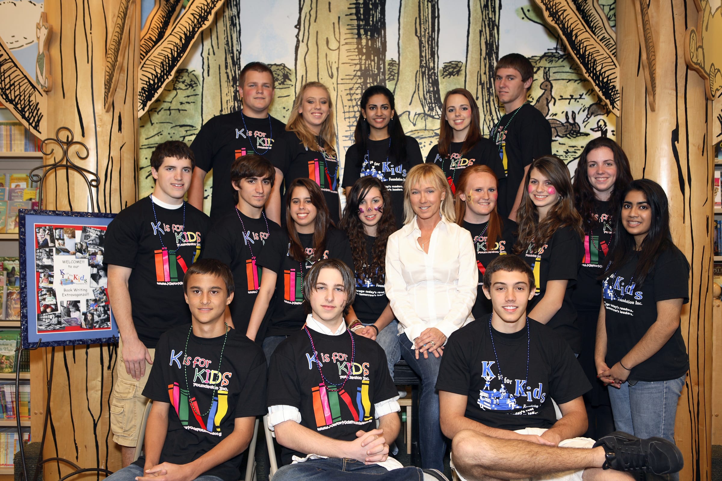 Photo by Karen Walsh Haupt. 2010: Student leaders of the Teen Advisory Team 2010 pause for a group portrait with Founder Karen D. Clawson. Barnes & Noble at the Waterside Shops in Naples. Back row: Joshua Patterson, Erin Clawson, Jasna Gopolan, Alexis Martin and Justin Williams. Middle row: Matthew Colligan, Philip Scire, Nicole Casey, Alexis Akinson, Karen Clawson, Hailee Lamb, Dezree’ MacDonough, Sydney Brodie and Radhika Gopalan. Seated: Troy Placid, Cory Jones and Holden Giles.