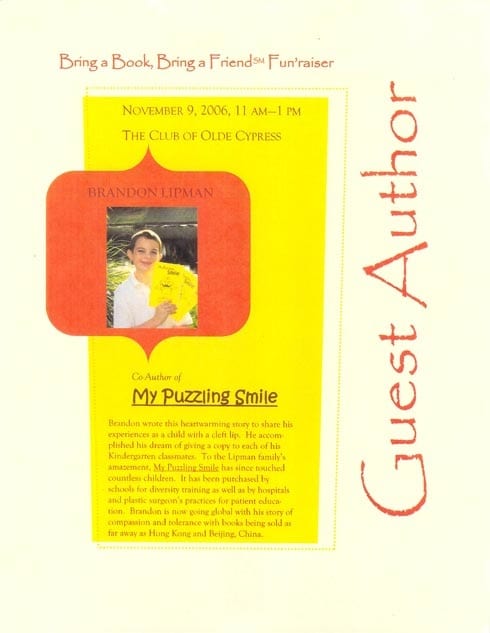 Brandon Lipman signs copies of his book “My Puzzling Smile”, that shares the struggles he endured as a child born with cleft palate.