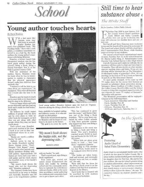 Brandon Lipman was the first student to be featured as a guest author at the annual Bring a Book, Bring a Friend Fun’Raiser 2006. The event was hosted by Jill Miles at Olde Cypress Country Club in Naples