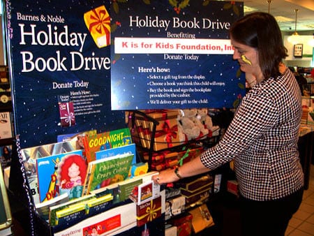 Each year since 2008, Barnes & Noble Booksellers has conducted its Holiday Book Drive benefiting K is for Kids. Hundreds and sometimes thousands of books are generously donated by its patrons for K is for Kids to distribute to children in need throughout the holidays and into the New Year.