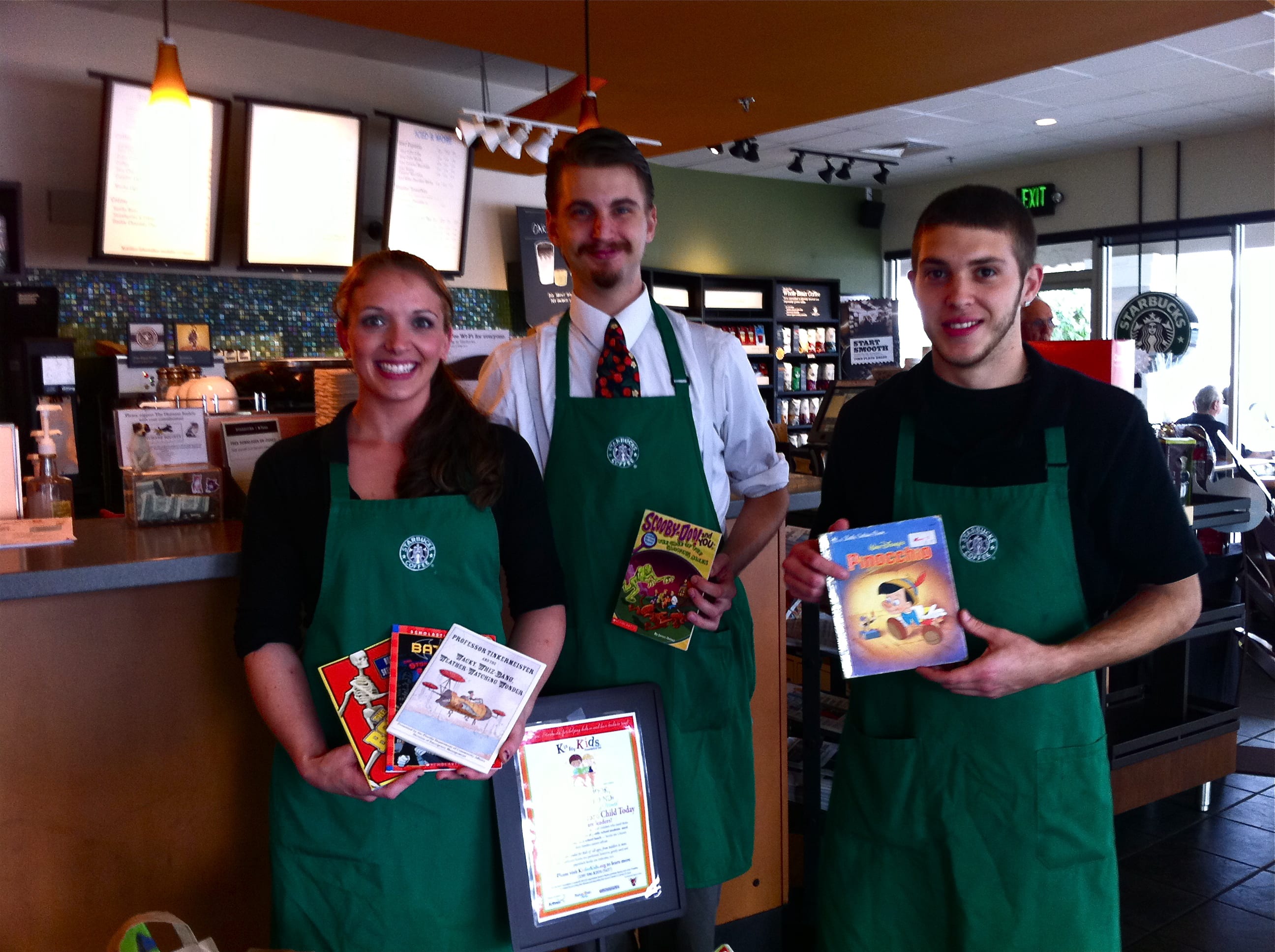 K is for Kids wishes to thank all the Starbucks partners who have collected books for Collier County children every year during our Bring a Book, Bring a Friend for Children’s Literacy Month. Thanks to Starbucks, K is for Kids is now addressing children’s needs in Lee County, too. Since October of 2008, when we launched our first county-wide book drive under the umbrella of K is for Kids Foundation, Starbucks partners have collected thousands of books. Shown above, Starbucks partners at Berkshire Lakes show a few books of the bounty they received, much of which, they reported, were from one mom who donated boxes to the cause.