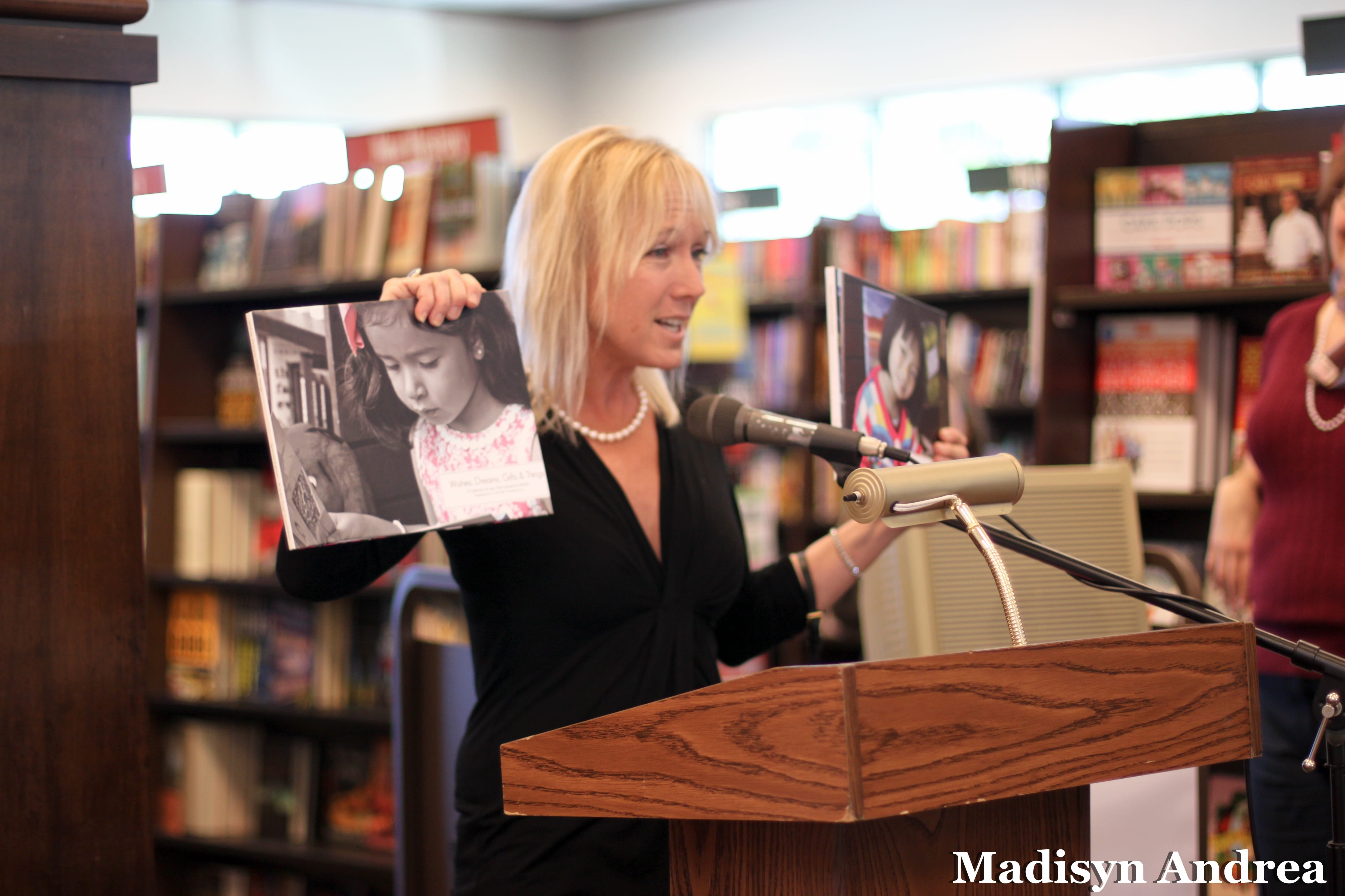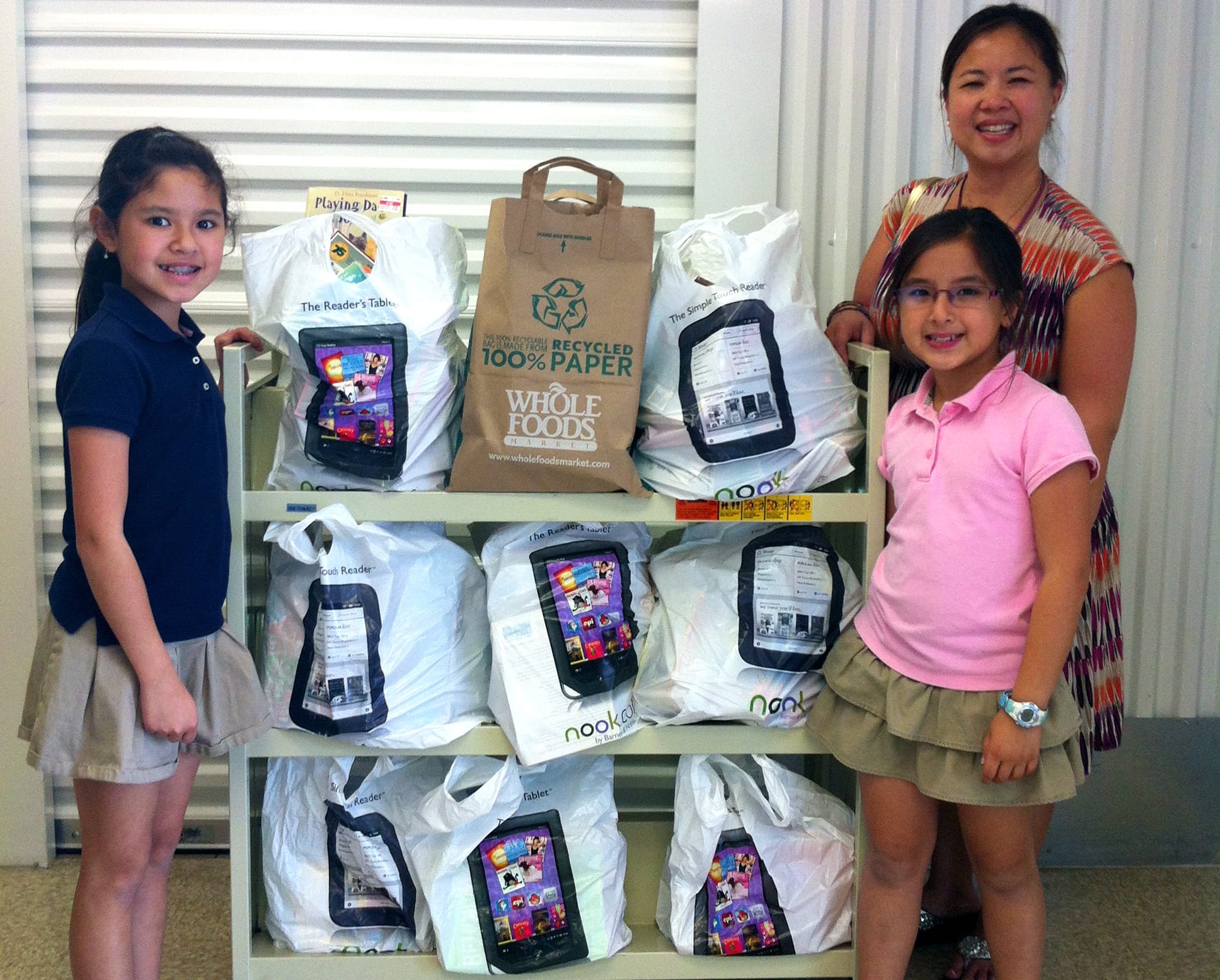For the following three years, Karen recruited a new family in a different neighborhood to host the Bring a Book, Bring a Friend(sm) Fun’raiser and helped to organize and promote the event. Erin and Patrick also found fun ways for kids to participate — students could select the book(s) that they wished to donate or delivered their family’s donation(s) personally. The media specialists reported when the children came into the library bearing their gifts, their faces were beaming, and their smiles were so big! Kids also were invited to gather in the school library to be photographed for the thank you cards to donors. One of the biggest thrills came when the media specialist invited some of the school’s most avid readers to join her and Karen at the local bookstores to give their recommendations on books students would enjoy reading.