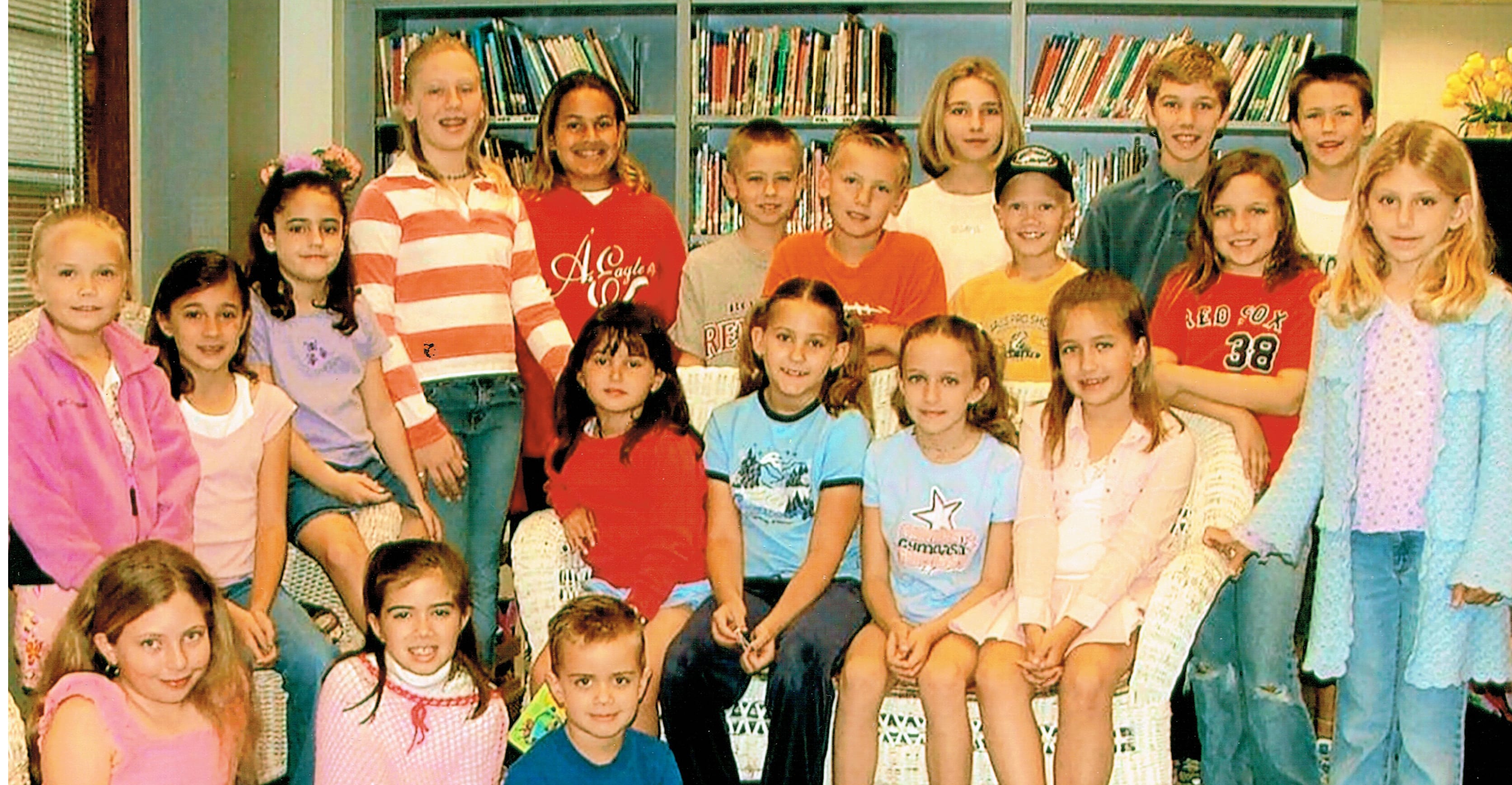 Erin Clawson (back row, fourth from left) and Patrick Clawson Jr. (sixth from left) join students in their school library for a thank you photo to donors.